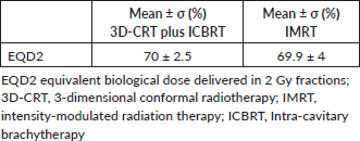 Table 6. Treatment boost: equivalent biological dose delivered in 2 Gy fractions (EQD2) for tumour (α/β = 10 Gy).